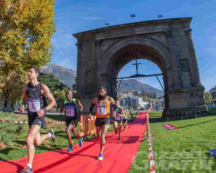 Nella foto di Alexis Courthoud il gruppo di testa alla MezzAosta nel suggestivo passaggio sotto l’Arco d’Augusto.