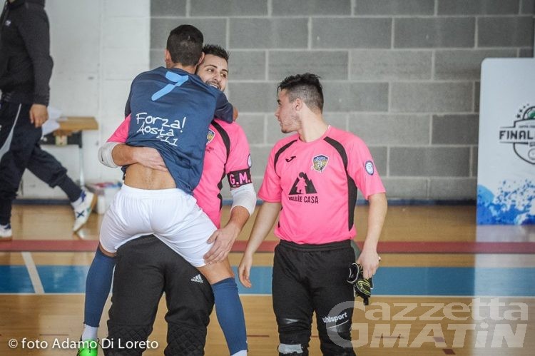 L’Aosta 511 è in finale della Coppa Italia Under 21. I gialloblu di Rodrigo Rosa (espulso per proteste nella ripresa) hanno battuto questa mattina a Martinsicuro 6-2 il Kaos Futsal di Ferrara e domani mattina alle 10.30 sfideranno la Carlisport Cogianco nella rivincita della finale scudetto 2015, quando a vincere furono i romani.